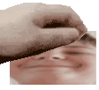 A pixel art hand covers Homola's face in a squish animation. The sticker features Homola in a unique, stylized form.