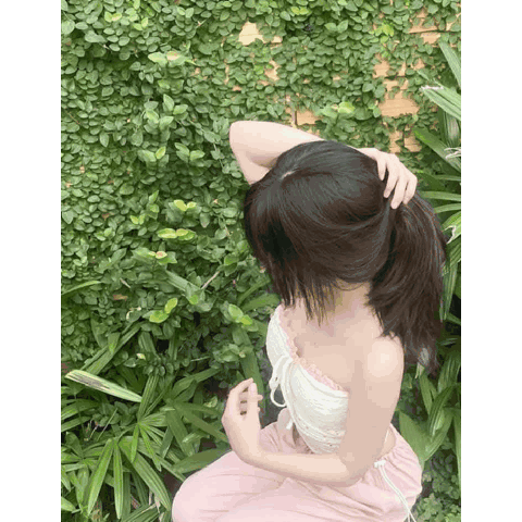 A woman in a white top and pink pants poses gracefully in a lush green garden, adjusting her long dark hair.