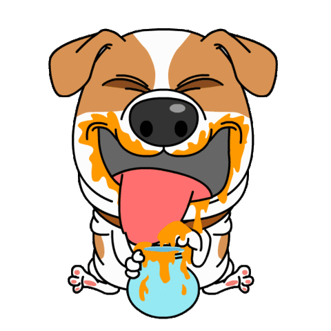 A cute cartoon dog happily licks a honey pot with a long tongue, getting honey all over its face.