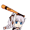 Kiana Kaslana in pixel art style, holding a large orange crayon or bat over her head, ready for action.
