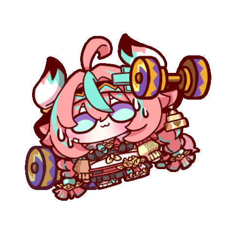 An adorable Honkai Star Rail and Genshin Impact character, a pink-haired girl, struggles to lift heavy dumbbells.