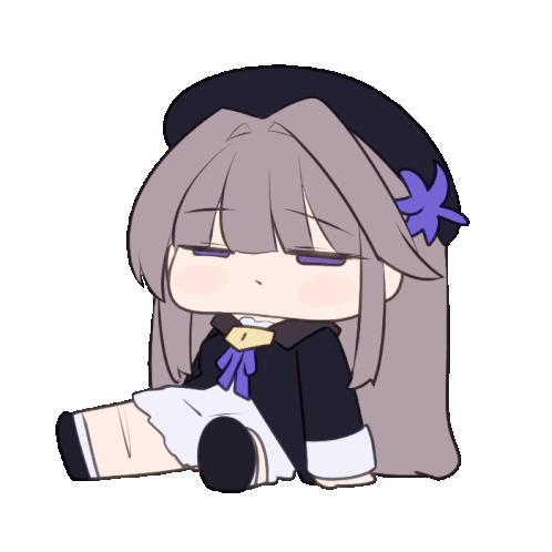 Chibi Herta from Honkai Star Rail sits with a tired expression, wearing a dark outfit and beret with a purple accent.