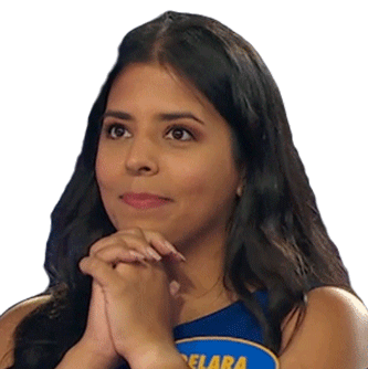Delara from Family Feud Canada shows a hopeful and praying expression, hands clasped together in anticipation.