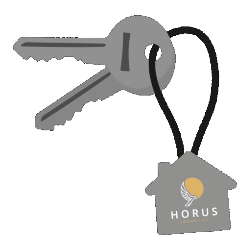Animated sticker featuring house keys with a 'Horus Immobilier' house-shaped keychain, perfect for real estate themes.