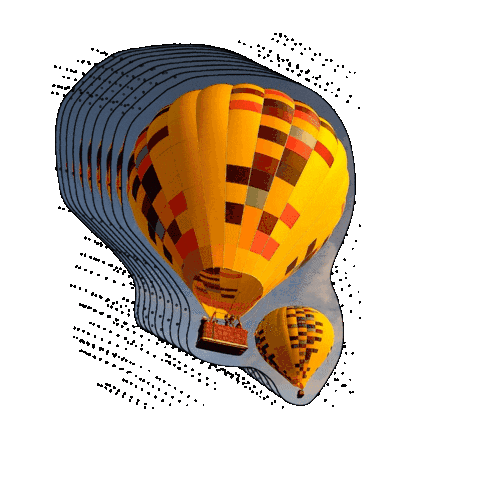 Two vibrant hot air balloons ascend against a blue sky, depicted with an artistic, wavy effect, evoking a sense of dreamy flight.