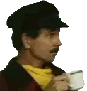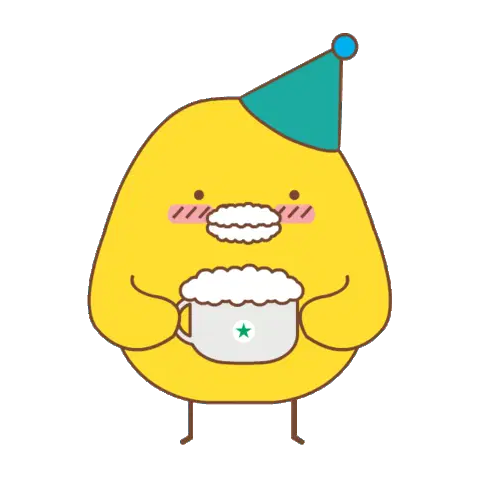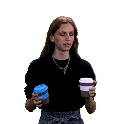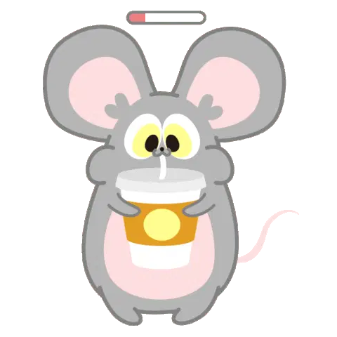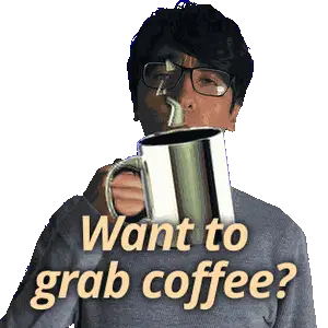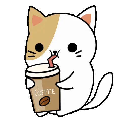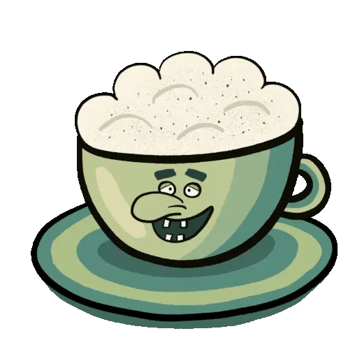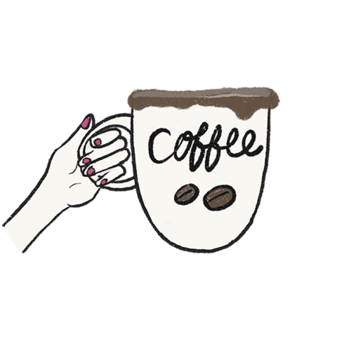 A cartoon hand holds a white coffee mug with 'Coffee' written on it, featuring coffee beans and a frothy rim.