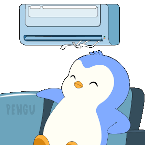 Pengu the cute penguin relaxes on a couch, enjoying the cool air from the air conditioner.