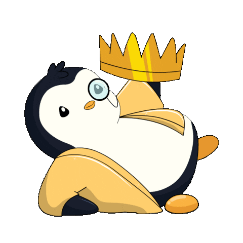 A regal Pudgy Penguin character strikes a 'hot model' pose, wearing a golden crown and monocle, looking quite dapper.