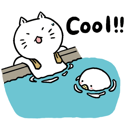A cute cartoon cat with a towel enjoys a hot spring bath with a small duck, exclaiming 'Cool!!!' in a speech bubble.