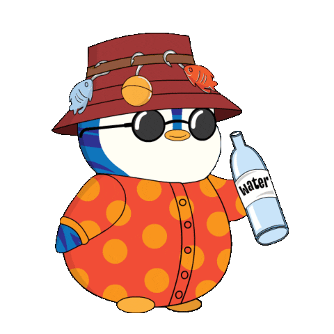 A cute Pudgy Penguin, dressed in a fishing hat and polka-dotted shirt, drinks water to hydrate during a hot summer day.