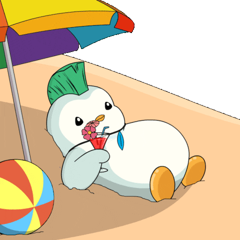 A cute, pudgy cartoon character with a green mohawk relaxes on a sandy beach under a colorful umbrella, enjoying a drink.