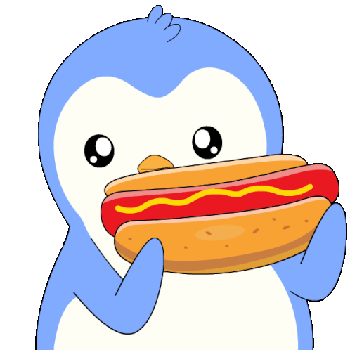 a cartoon penguin is eating a hot dog with mustard on it