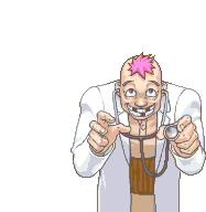 Director Hotti from Ace Attorney with a manic grin, holding a stethoscope and reaching out.