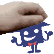 A hand gently pets a smiling blue pixel art character, identified as House Orbit, wearing a red bow tie.