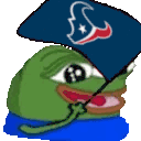 A cheerful Pepe the Frog character proudly wearing a Houston Texans flag as a hat, showing team spirit.