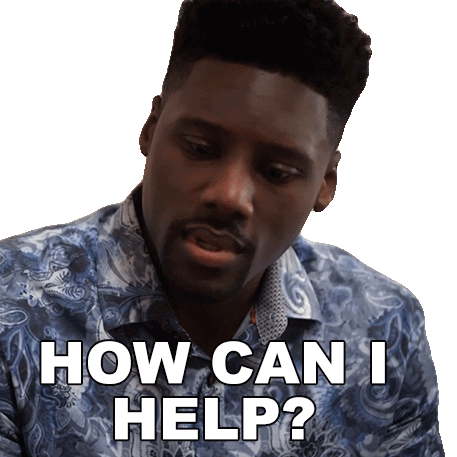 Ellis E. Fowler as Bayo from BET Sistas asks, 'How can I help?' in a blue patterned shirt, offering assistance.