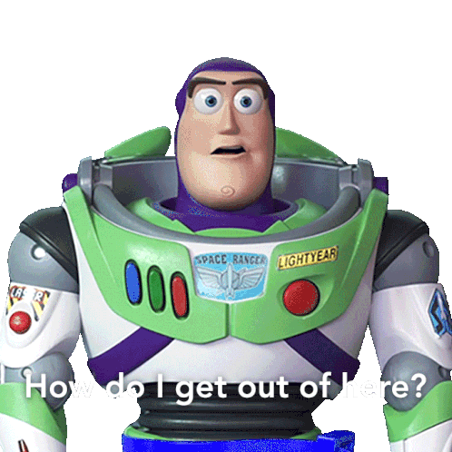 Buzz Lightyear, the Space Ranger from Toy Story, looks confused and asks, "How do I get out of here?"