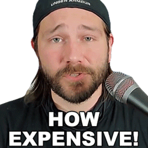 Michael Kupris reacts with a dramatic 'How Expensive!' expression, speaking into a microphone.