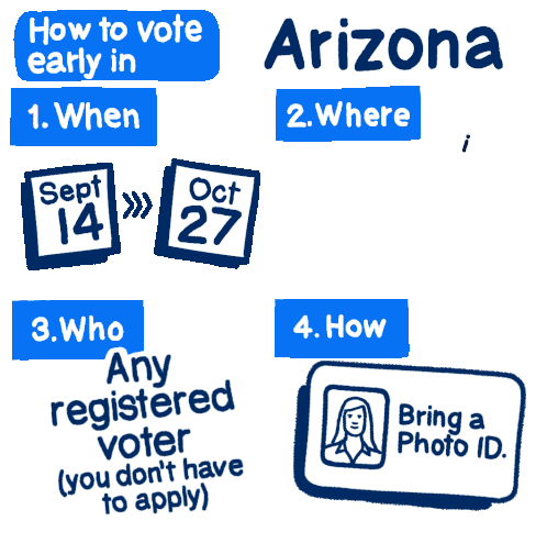 An animated guide on how to vote early in Arizona, detailing when, who, and how, including dates and ID requirements.