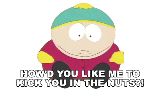 Eric Cartman from South Park angrily asks, "How'd you like me to kick you in the nuts?!" in this animated sticker.