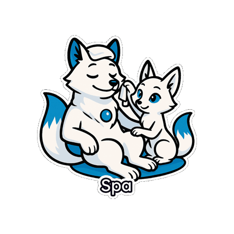 a sticker of two white foxes with the word spa on the bottom