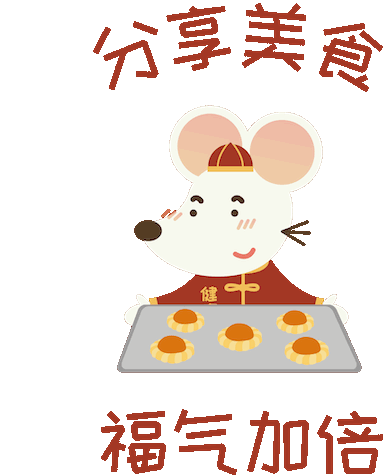 A cute Chinese New Year mouse in traditional attire shares pineapple tarts, wishing "Share delicious food, double good fortune."