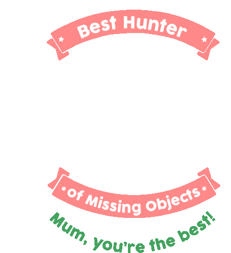A Mother's Day sticker celebrating "Mum, the Best Hunter of Missing Objects," featuring a magnifying glass finding items.