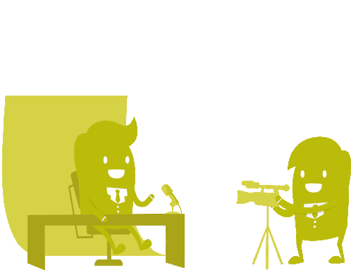 Animated sticker showing a cartoon interview scene with a speaker and a cameraman, featuring Hsp Software and Taxo branding.