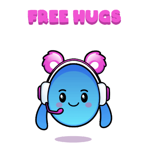 An adorable blue character with headphones offers free hugs, spreading love and kindness with open arms and hearts.