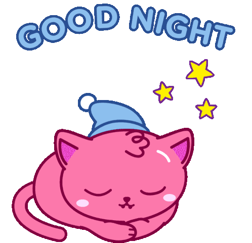 Adorable pink cat in a blue sleep cap, happily yawning and then sleeping, with 'GOOD NIGHT' text and stars.