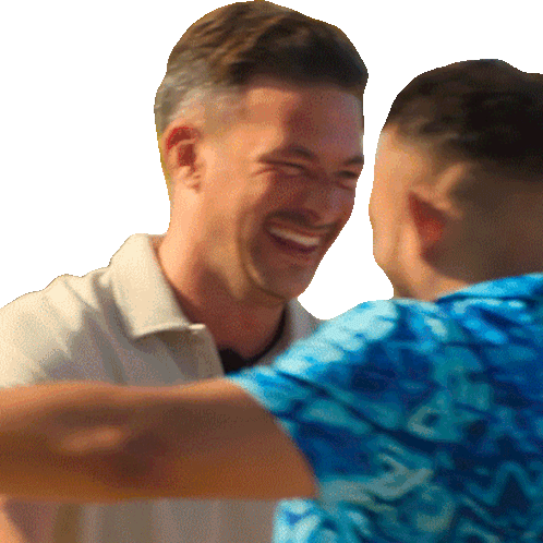 Steven Smith and Bobby Johnson share a warm embrace, smiling happily during a moment from Love is Blind UK.