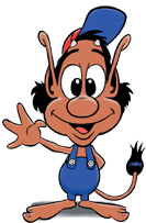 Hugo Hola, a friendly cartoon character in blue overalls and a hat, waves cheerfully, perfect for greetings.