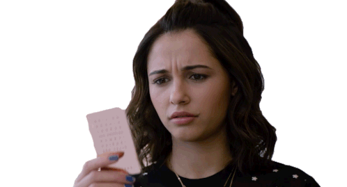 Elena, played by Naomi Scott, looks confused while holding a card, then her expression changes to surprise as the "Townsend Agency" logo becomes clear.