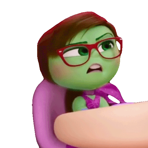 Disgust from Inside Out 2, wearing red glasses and a purple top, shows a confused and skeptical reaction.