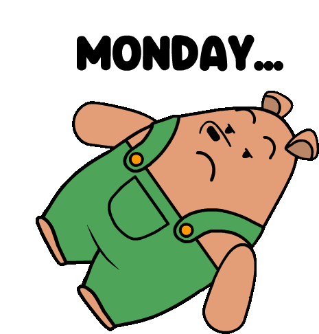 A tired cartoon bear in green overalls reacts to Monday with a 'Huhh Huh' expression, embodying the Monday blues.