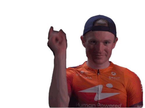 August Jensen, wearing his Human Powered Health cycling jersey and a cap, points directly at the viewer with a friendly smirk.
