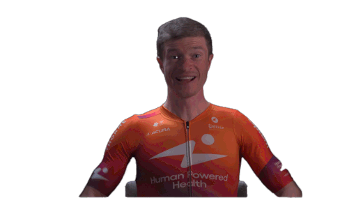 Ben King, the Human Powered Health cyclist, celebrates with fists raised and a wide, triumphant smile.