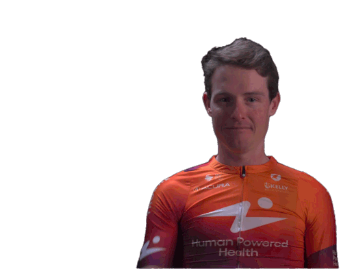 Cyclist Gavin Mannion from Human Powered Health makes a gesture with his hand, expressing a thought or idea.