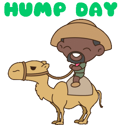A cartoon man rides a camel with 'HUMP DAY' text, celebrating the middle of the week, featuring Kevin Hart.