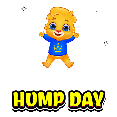 A cute lion cub jumps excitedly as 'Hump Day' and 'Wednesday' appear, celebrating the middle of the week.