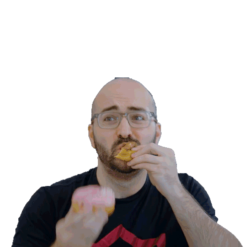 Seth, a bald man with glasses, hungrily eats a pink frosted donut, holding another pastry piece.