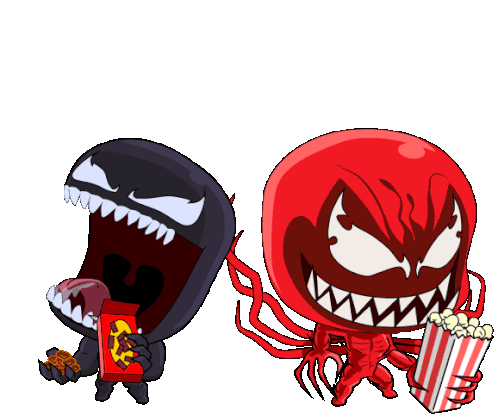 Chibi Venom and Carnage eagerly devour snacks, with Venom enjoying candy and Carnage munching on popcorn.