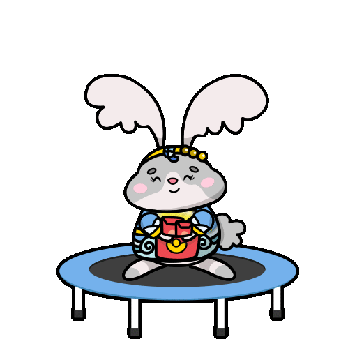 A cute rabbit character jumps happily on a trampoline, with 'HOPPY' text, celebrating Huntyourzodiac2022 Dbscny.