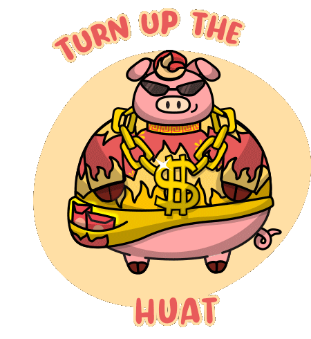 A cool, blinged-out pig with sunglasses and gold chains, rotating with the text "TURN UP THE HUAT", celebrating Chinese New Year.