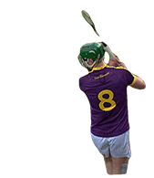 A hurler in a purple and yellow jersey with number 8, wearing a green helmet, in a powerful striking pose.