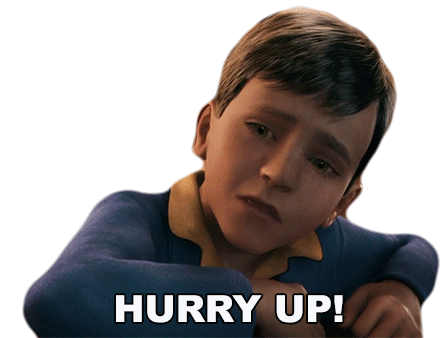 Hero Boy from The Polar Express urgently exclaims "Hurry Up!" with a distressed expression, signaling impatience.