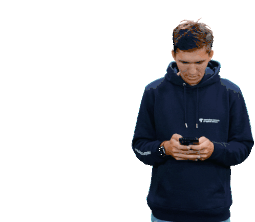 A student from Hogeschool Van Amsterdam reacts with surprise and joy to good news received on their phone.