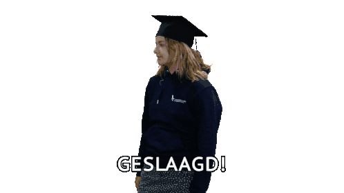 A happy Hogeschool Van Amsterdam student celebrates passing her exams, holding her diploma and exclaiming 'GESLAAGD!'