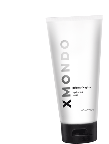 A white tube of XMONDO Prismatic Glow Hydrating Mask, showcasing the product for hair care and hydration.