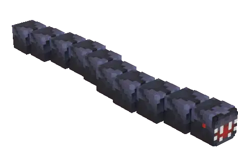 An animated sticker featuring the dark, segmented Scatha creature from Hypixel Skyblock, moving in an arc.